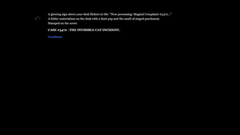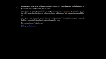 Welcome to the Bureau of Magical Complaints, where paperwork meets enchantment and nothing ever goes according to plan. As a trainee clerk, you’ll face a long day of unpredictable cases, questionable magic, and even worse citizens — just another normal shift at the Bureau.